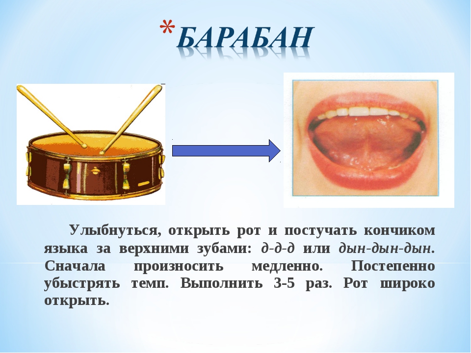 Необходимо улыбнуться, открыть рот, а языком постучать кончиком языка, при этом одновременно произносить «д-д-д». Все упражнение должно быть очень быстрым.