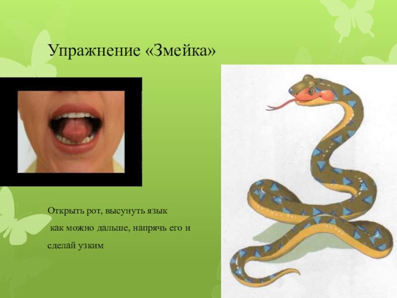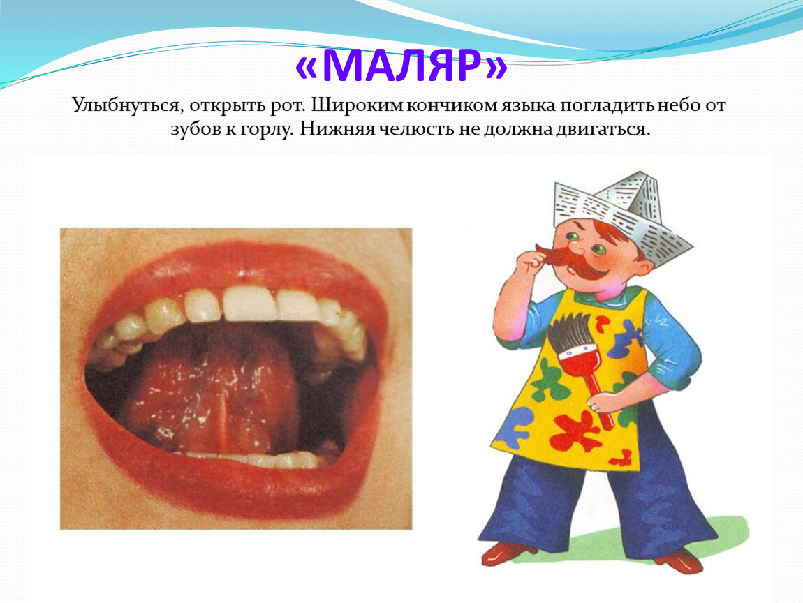 Улыбка, затем широко открыть рот и «покрасить» кончиком языка верхнее небо начиная с верхних зубов и потом обратно.