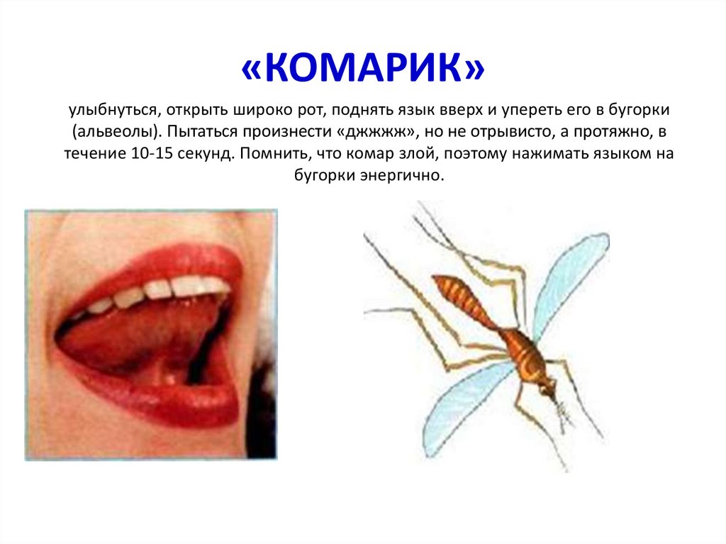 Рот открыть широко, поднять язык вверх. Кончик должен упереться в бугорки. А после требуется жужжать как комар.