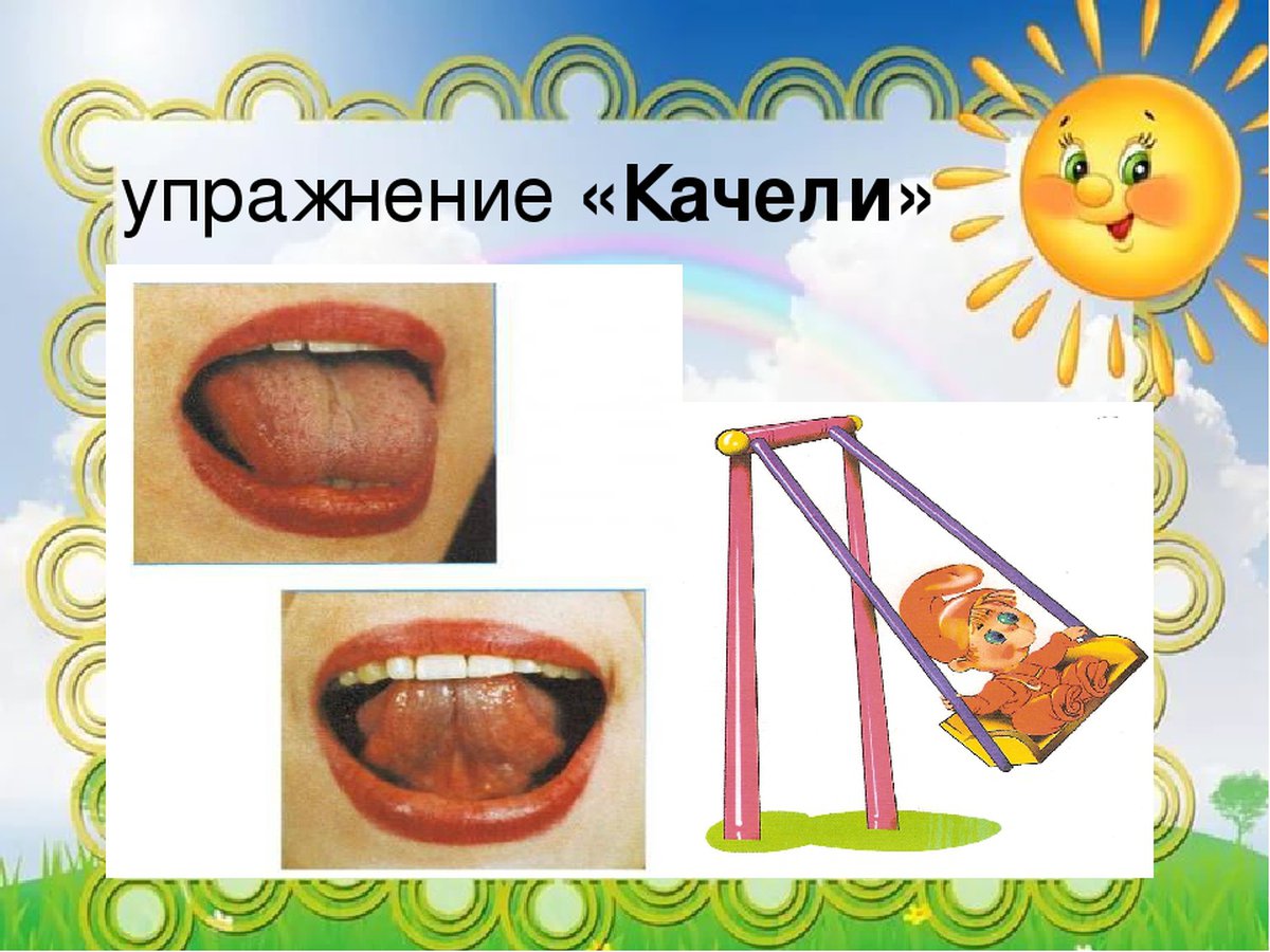 Улыбка, широко открывается рот и нужно коснуться кончиком языка сначала верхних зубов, потом нижних. После кончик следует задержать у верхних зубов секунд на 20.