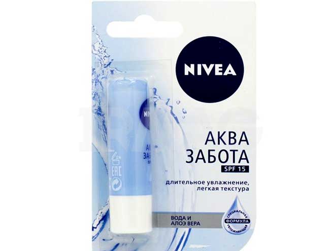 Nivea «АКВА Забота». Не только несет увлажняющие функции, но и помогает коже самостоятельно удерживать влагу на клеточном уровне. В состав вошли экстракт алоэ и несколько сортов восков, а также масло ши. Можно наносить как базу под помаду. Список отмеченных достоинств: