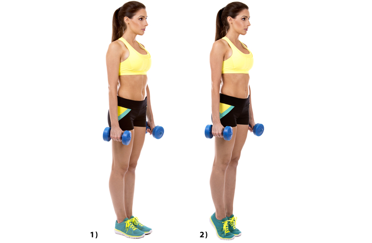 - Встать. Удобно расположить стопы. В руках держать гантели.